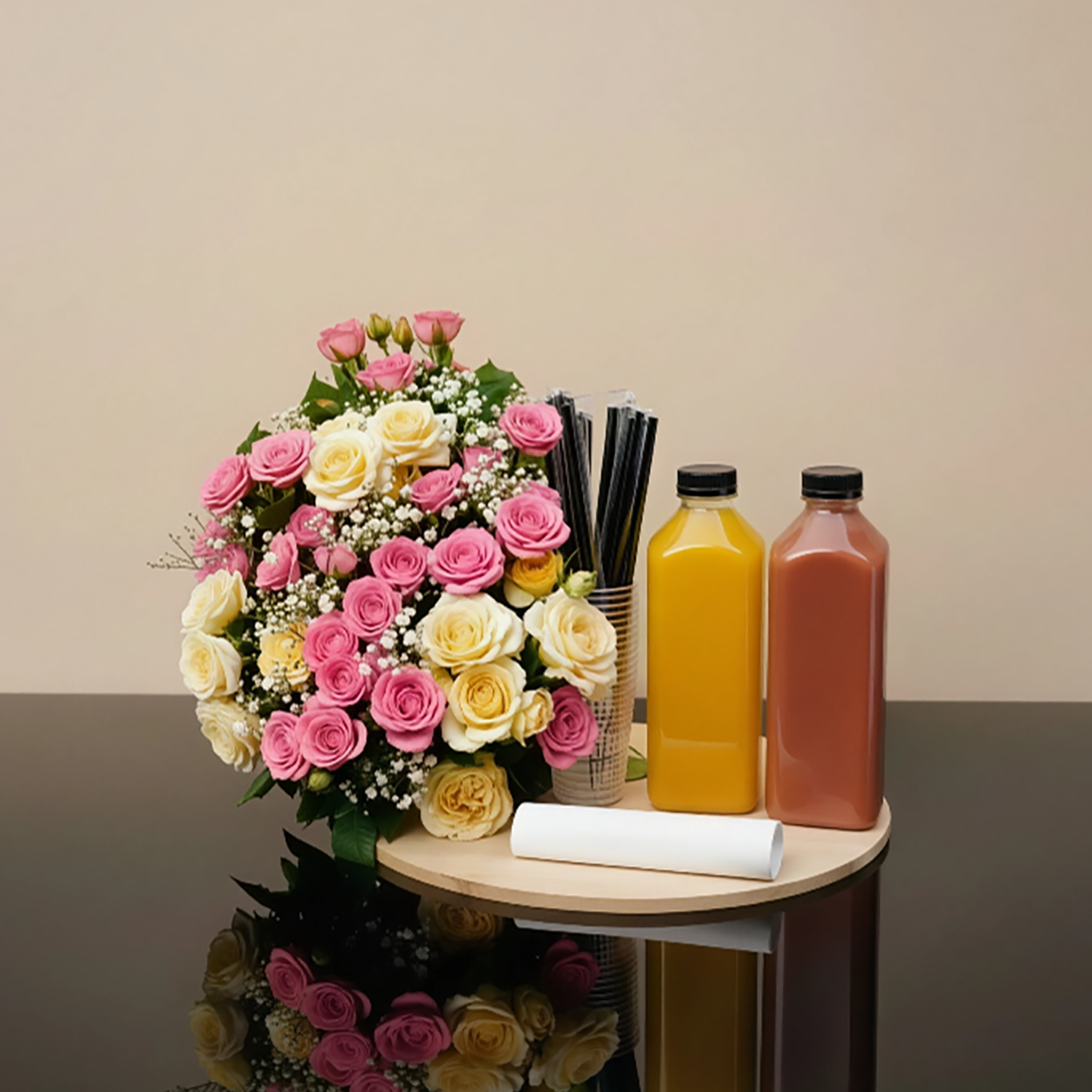 باقة دائرية مرتفعة (ستاند) تعتمد على تدرجات اللون الوردي والسكري (الأوف وايت) مع لمسات من زهور الجبسوفيليا الصغيرة التي تشبه النجوم. بجانب الورود، تترتب زجاجات العصير على قاعدة خشبية دائرية فاتحة اللون، . التنسيق يوحي بالبهجة واللطف، وهو مثالي لزيارات المرضى أو تجمعات الصديقات.