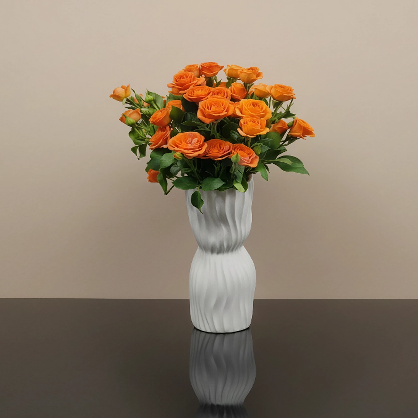“فازة ليان” – تنسيق فاخر من ورود البرتقال الناري داخل فازة بيضاء ذات ملمس مموج مزدوج، يضفي لمسة حيوية وأناقة دافئة لأي ركن من أركان المنزل أو المكتب.