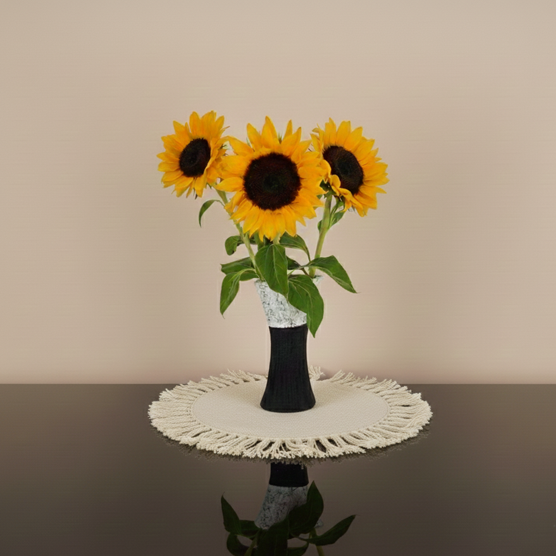 اجلب أشعة الشمس إلى يومك مع هذا التنسيق المميز من ثلاث زهرات عباد شمس طبيعية، موضوعة بعناية داخل فازة أنيقة بلون أسود وأبيض يضفي لمسة من التباين العصري.