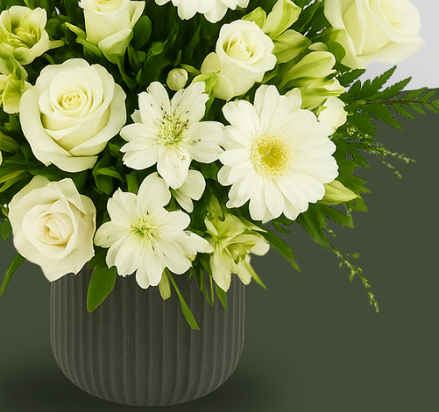 “فيوري” – تنسيق زهور أبيض أنيق في فازة رمادية أنيقة، يفيض بالرقي والبساطة الراقية، مثالي للمناسبات الهادئة أو لتزيين المساحات الراقية.
